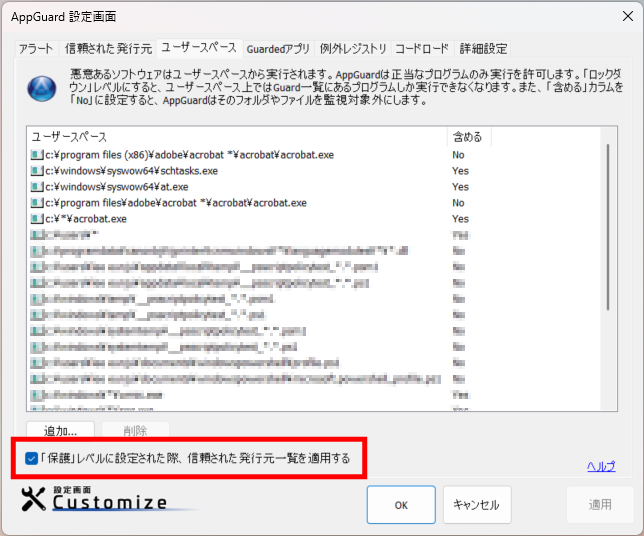 AppGuard設定画面の「ユーザースペース」タブ画面の下部に設定があります。