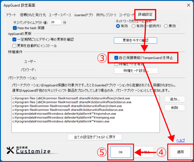 「自己保護機能 (TamperGuard) を停止」にチェックを付けて、画面右下の [適用] をクリックしてから [OK] をクリックします。