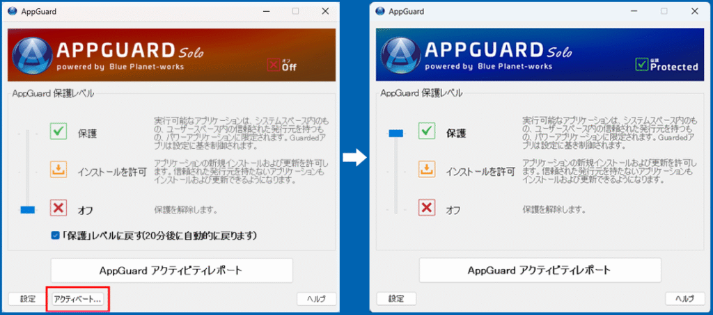 インターネットに接続できる環境で、アクティベートボタンをクリックすると自動的にアクティベーションされてAppGuardの保護が開始されます。