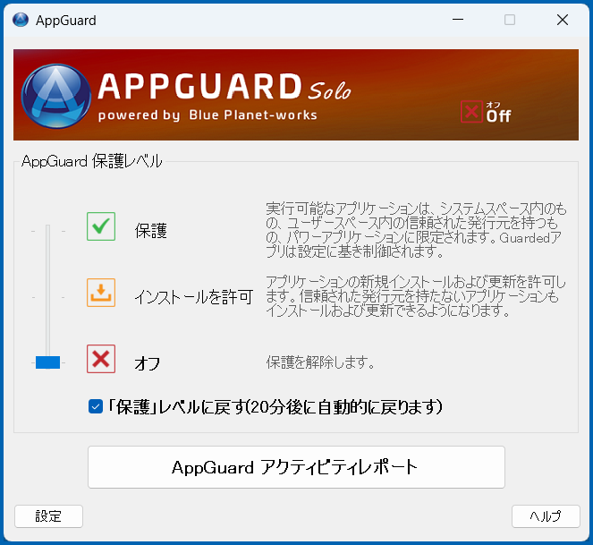 ユーザースペースに規定された場所から実行ファイル及びスクリプトの起動が許可されます。Guardedアプリケーションは引き続き保護されますが、一部のアプリ*は保護されません。この状態でウェブの閲覧を行うことは推奨されません。なお、この状態でもインストール等を完了できない場合は、保護レベルをオフにして再実行を試してください。