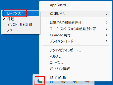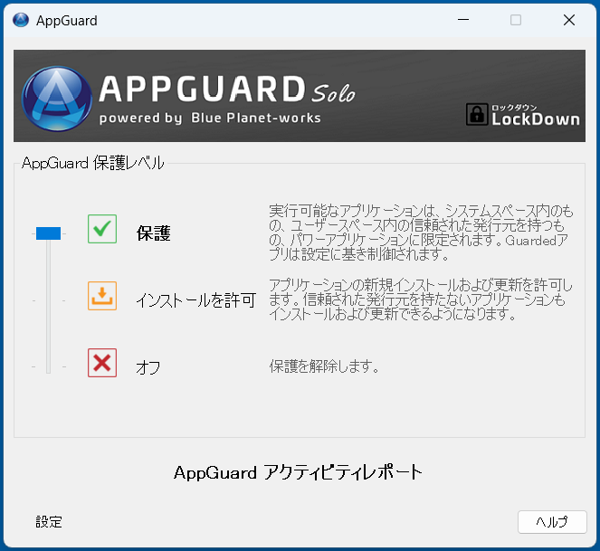 AppGuardは 4 段階の保護レベルが設定されており、ユーザーが切り替えることによって自動的にポリシーが変更されます。