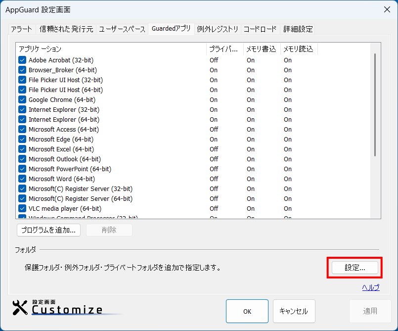 ④「フォルダを追加」ウィンドウに戻ったらリストに「C:\経費精算」が表示されていることを確認し、「Type」列を「例外(読み書き可)」に変更して [OK] をクリックします。これで「C:\経費精算」フォルダ内はGuardedアプリケーションから読み書き可能な領域として認識されます。