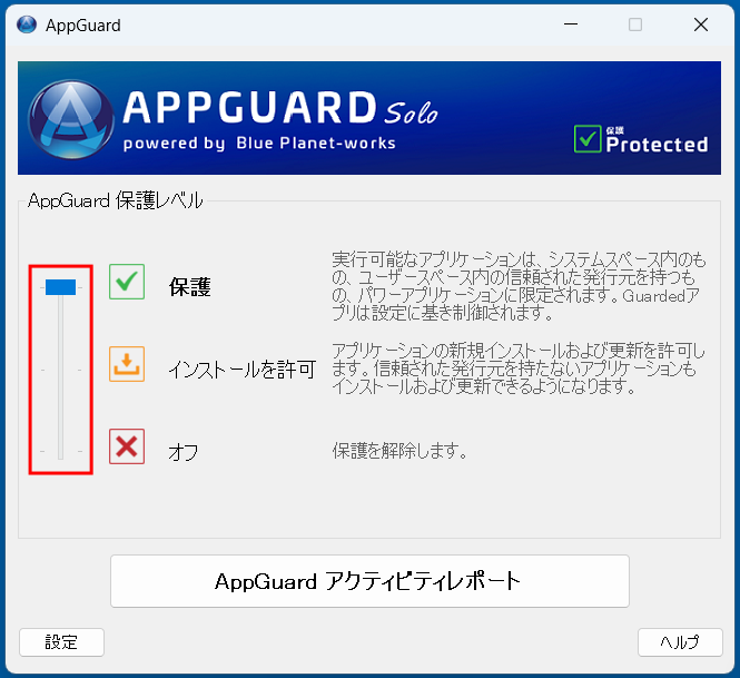左側の青いスライダーバーを操作し、保護レベルを「保護」に戻します。